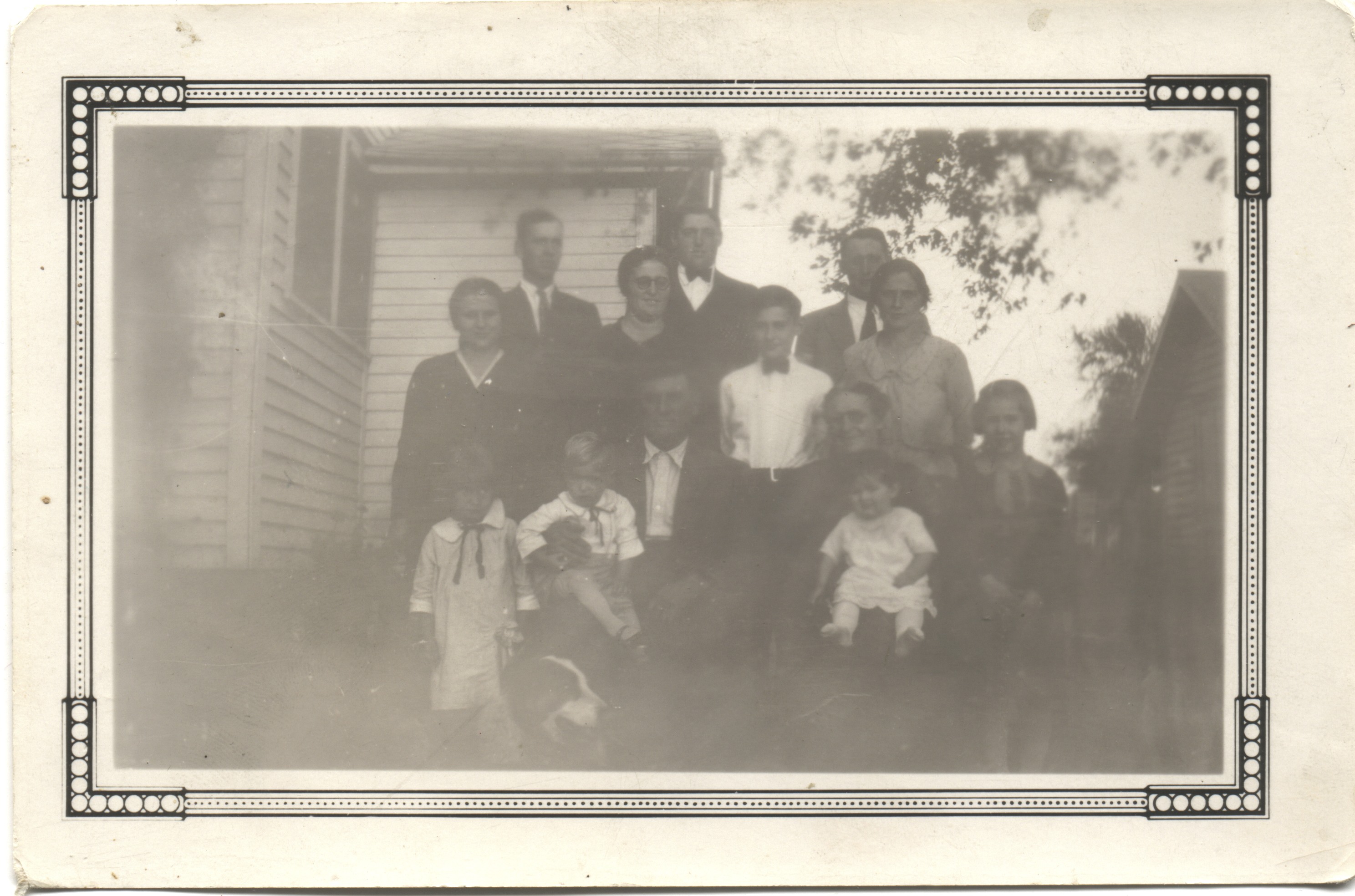 | Joseph Roth Family 1936c back left/rt: Earl Swartzendruber, Orie, Levi; middle: Helen, Mary, Ray, Mayme; front: Marie, Joseph holding Max, Fannie holding Miriam, Elsie [I think] Taken at Roth Homeplace on Hwy 78 | 0422.jpg | Order |