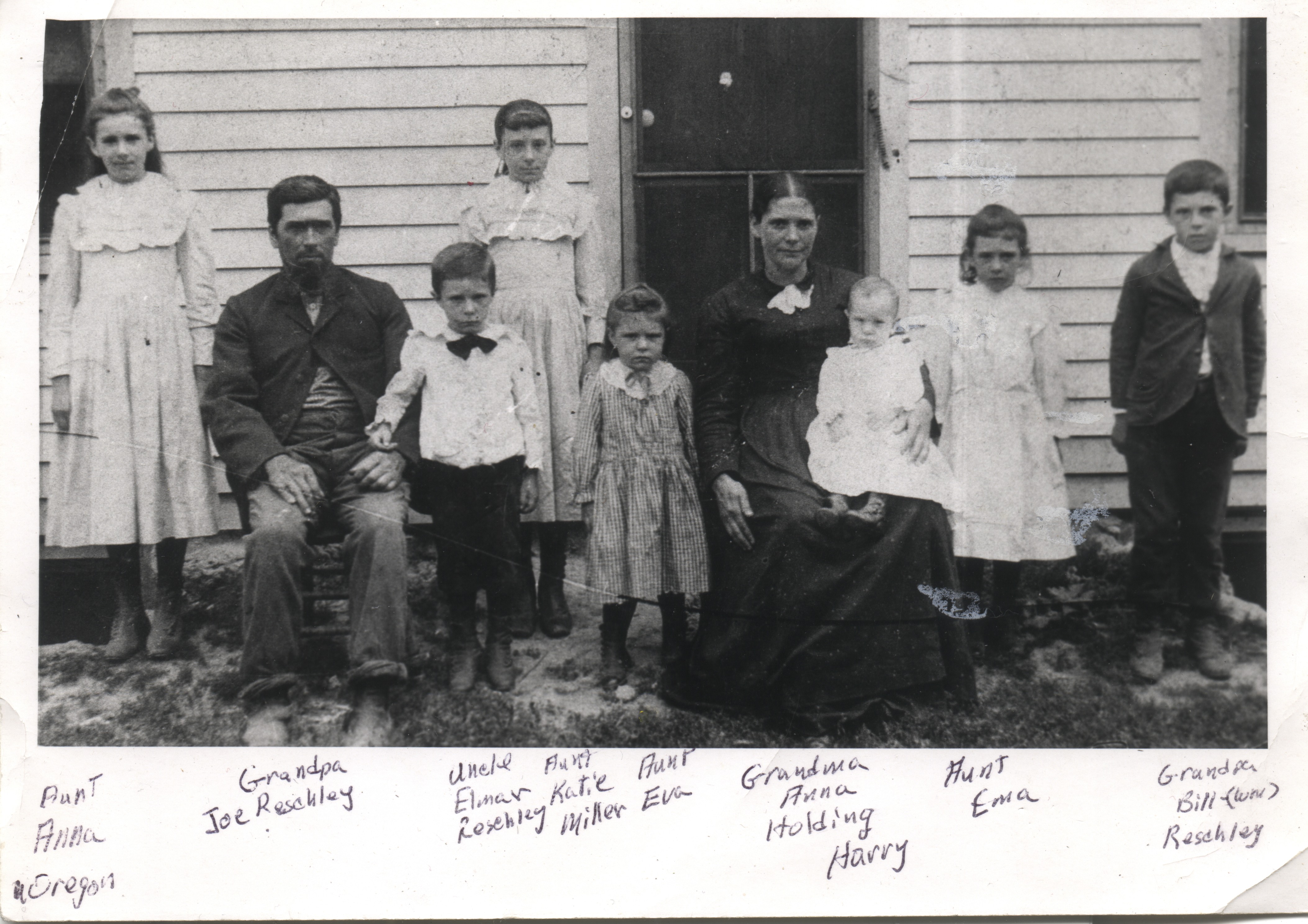 Joseph & Anna Reschly Family Left to right: Katie [Miller], Joseph, Elmer, Esta [Roth], Eva [Boese], Anna, Harry [lap], Emma [Roth], William Reschly 1895c | 0736.jpg