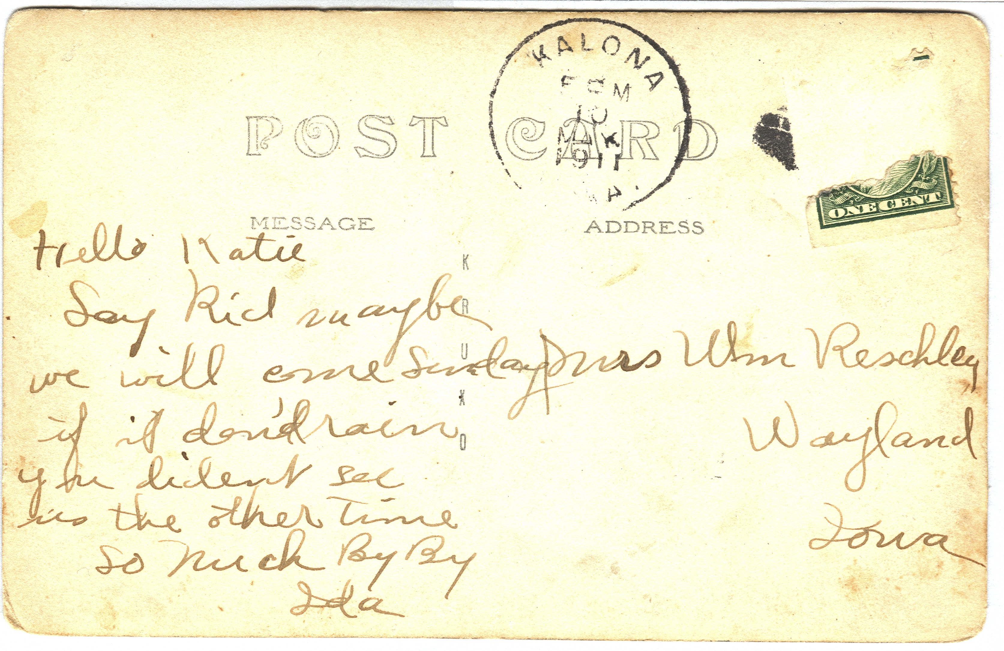 To Mrs. Wm Reschly, Wayland IA. From Kalona, IA May 10, 1911.'Hello Katie, Say kid, maybe we will come Sunday if it don't rain. You didn't see us the other time. So much by by. Ida' | 0867B.jpg