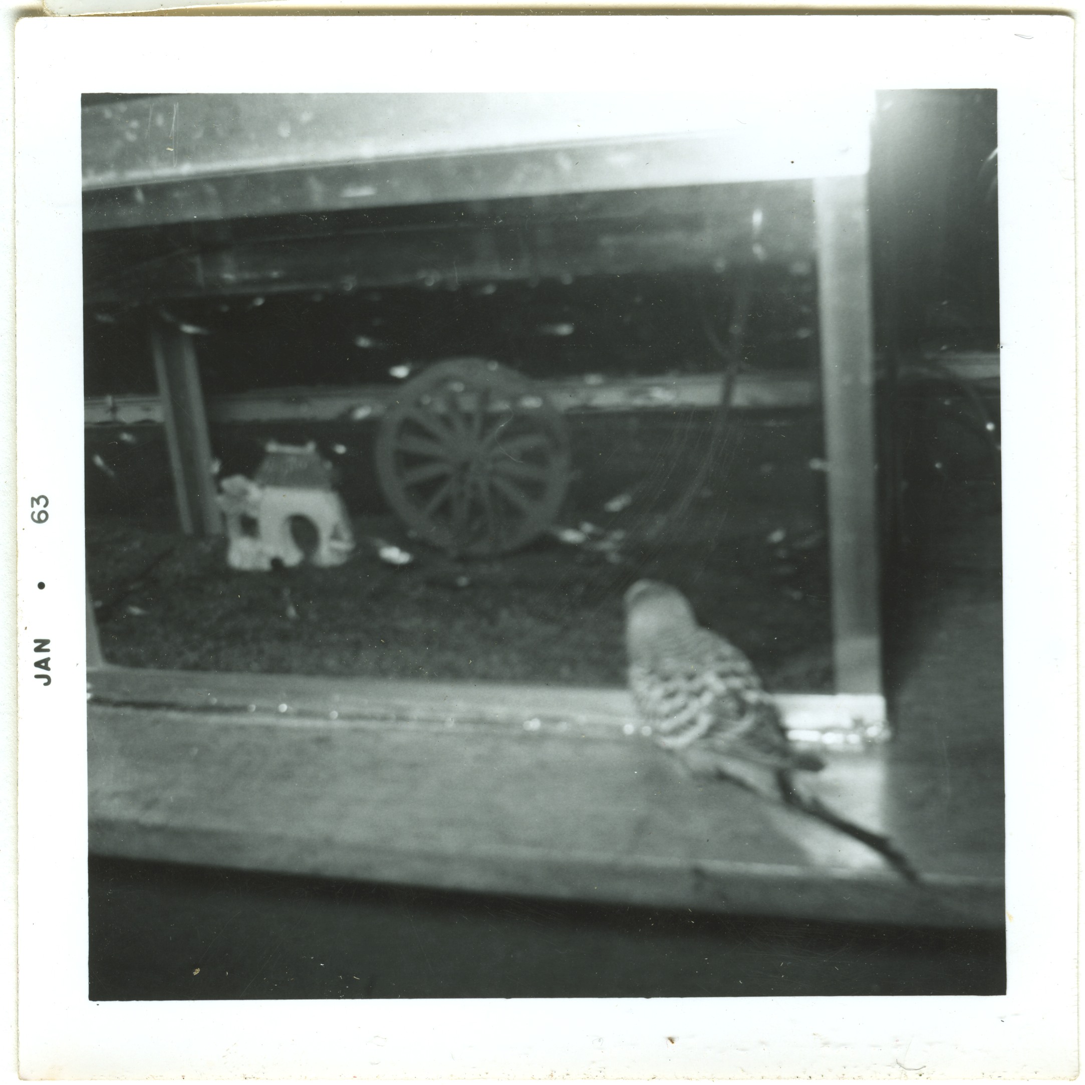 Perky, the parakeet at the fish tank. 1963.