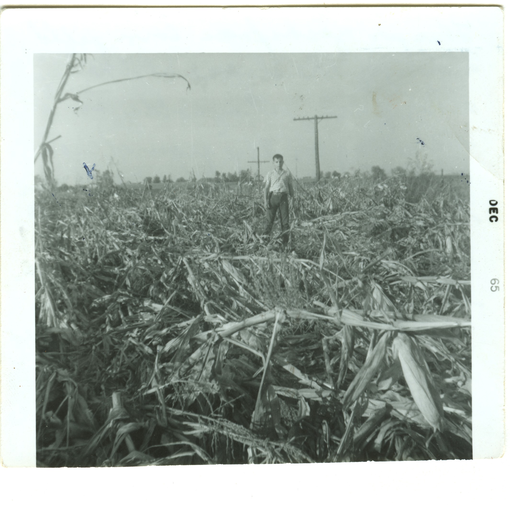 Reynolds Roth standning in Earl Zickafoose's field of downed corn. 1965