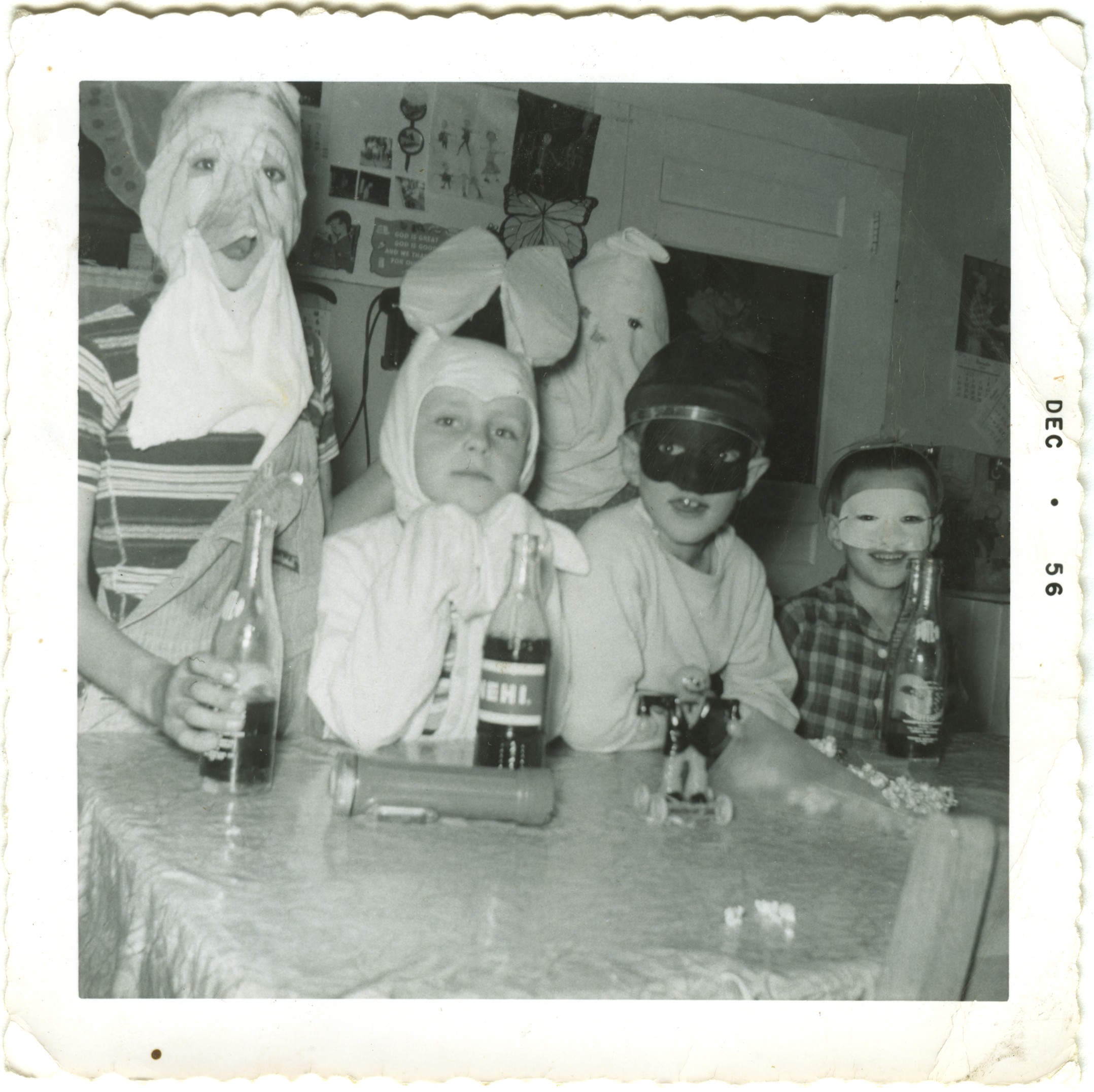 Fred Roth, Gerald Beckler [rabbit], Larry Roth [black mask], Lynn Roth [white mask], unknown in back. 1956