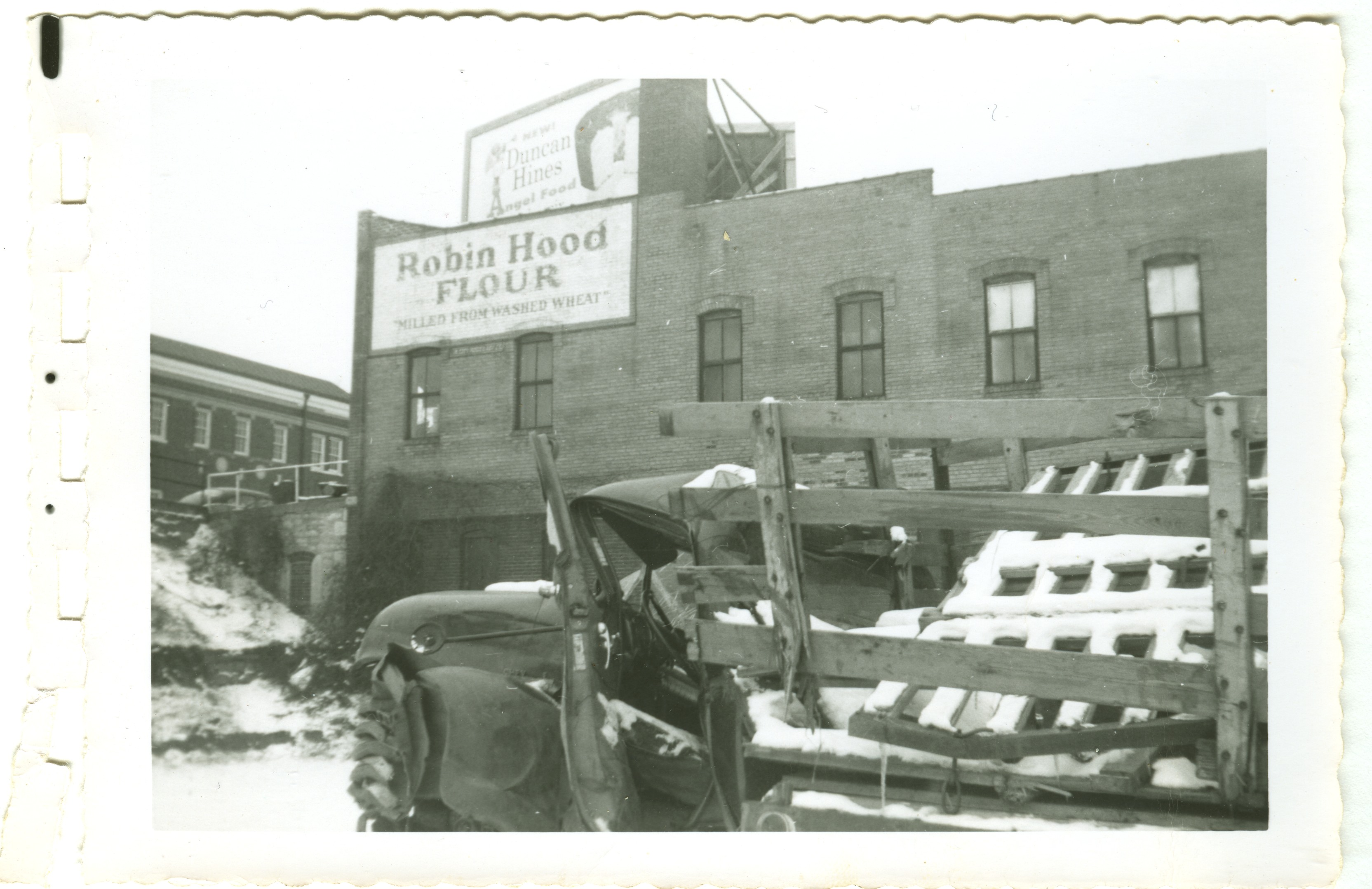 | Wrecked 54 Chevy 1 ton dualie truck driven by Levi Roth with Ray Roth as passenger. They were taking a load of Easter lambs to market in Waterloo, IA. A semi jack-knifed on ice, and the trailer slammed into them. Levi was pinned inside and Ray was thrown from the truck. Gas leaked from the tank and a fire started under the truck where Levi was. George Widmer came by in a semi and put out the fire with his fire extingisher. This occurred 1/2 mi north of Coralville Lake on old 218. The truck was in a wrecking yard in Iowa City, IA. 1956 | 1233.jpg | Order | |