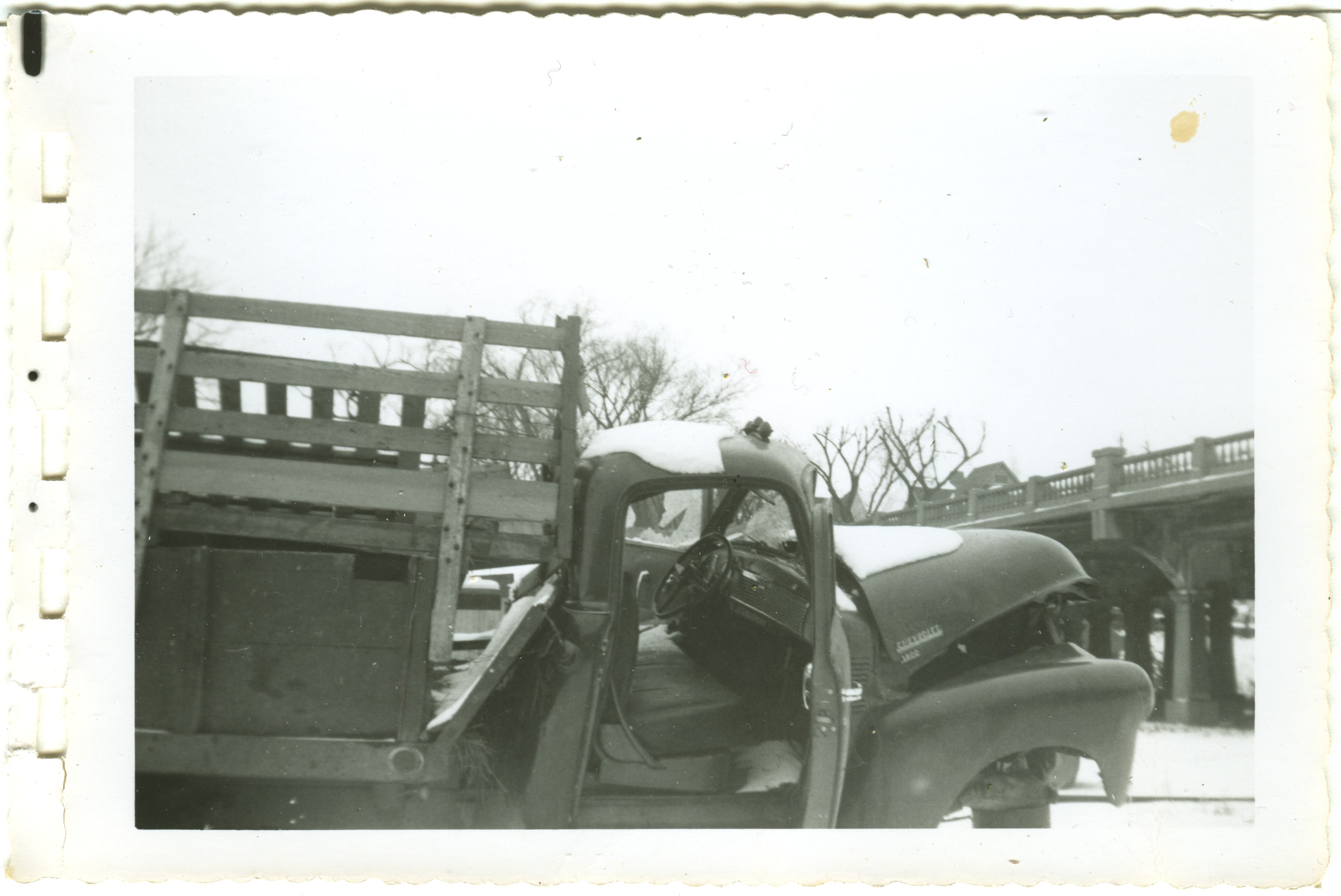 | Wrecked 54 Chevy 1 ton dualie truck driven by Levi Roth with Ray Roth as passenger. They were taking a load of Easter lambs to market in Waterloo, IA. A semi jack-knifed on ice, and the trailer slammed into them. Levi was pinned inside and Ray was thrown from the truck. Gas leaked from the tank and a fire started under the truck where Levi was. George Widmer came by in a semi and put out the fire with his fire extingisher. This occurred 1/2 mi north of Coralville Lake on old 218. The truck was in a wrecking yard in Iowa City, IA. 1956 | 1234.jpg | Order | |