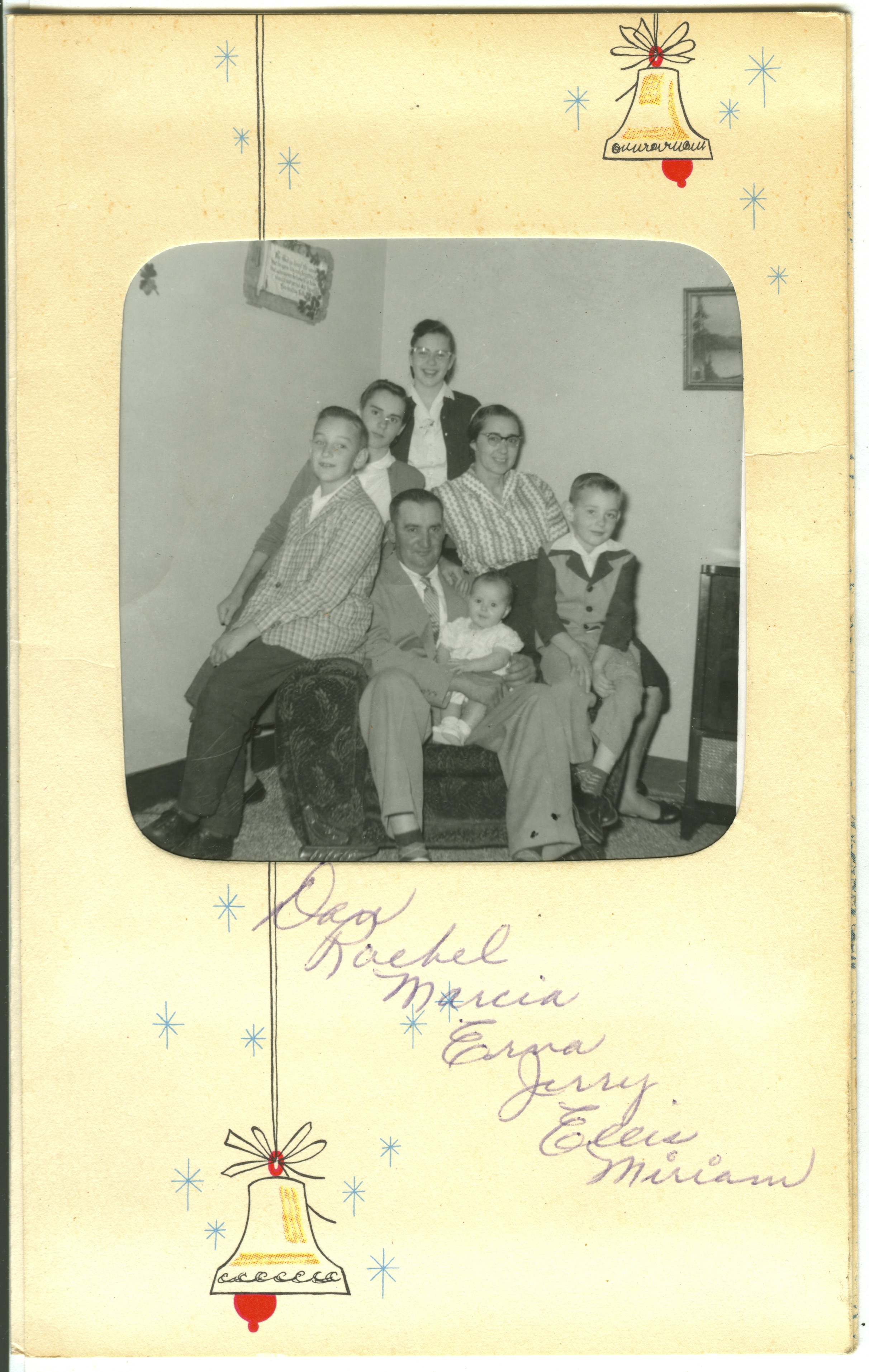 The Dan & Rachel Stutzman Family, 1961c. Dan sitting holding Miriam, Ellis on right, Jerry on left, Erna, upper left, Rachel, right, Marcia back. | 1321A.jpg