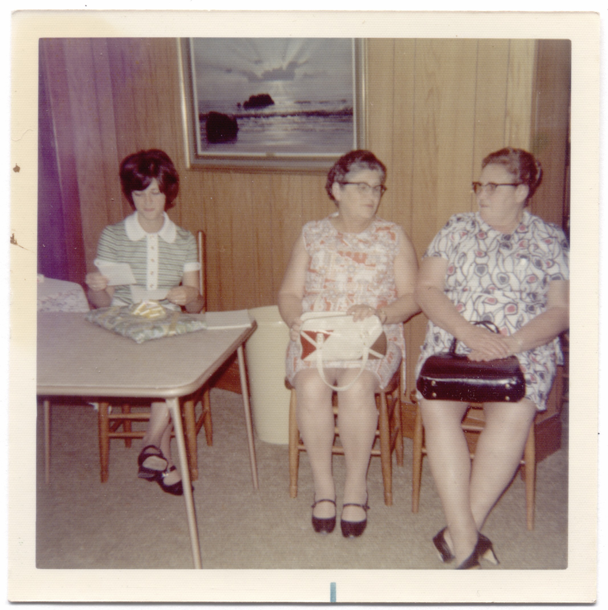 Bridal shower for Jeanette Septer. 1972 Married to Roy Beachy Aug 12, 1972 Jeanette & Mrs. Septer, Helen Beachy at Edna Roth's house.