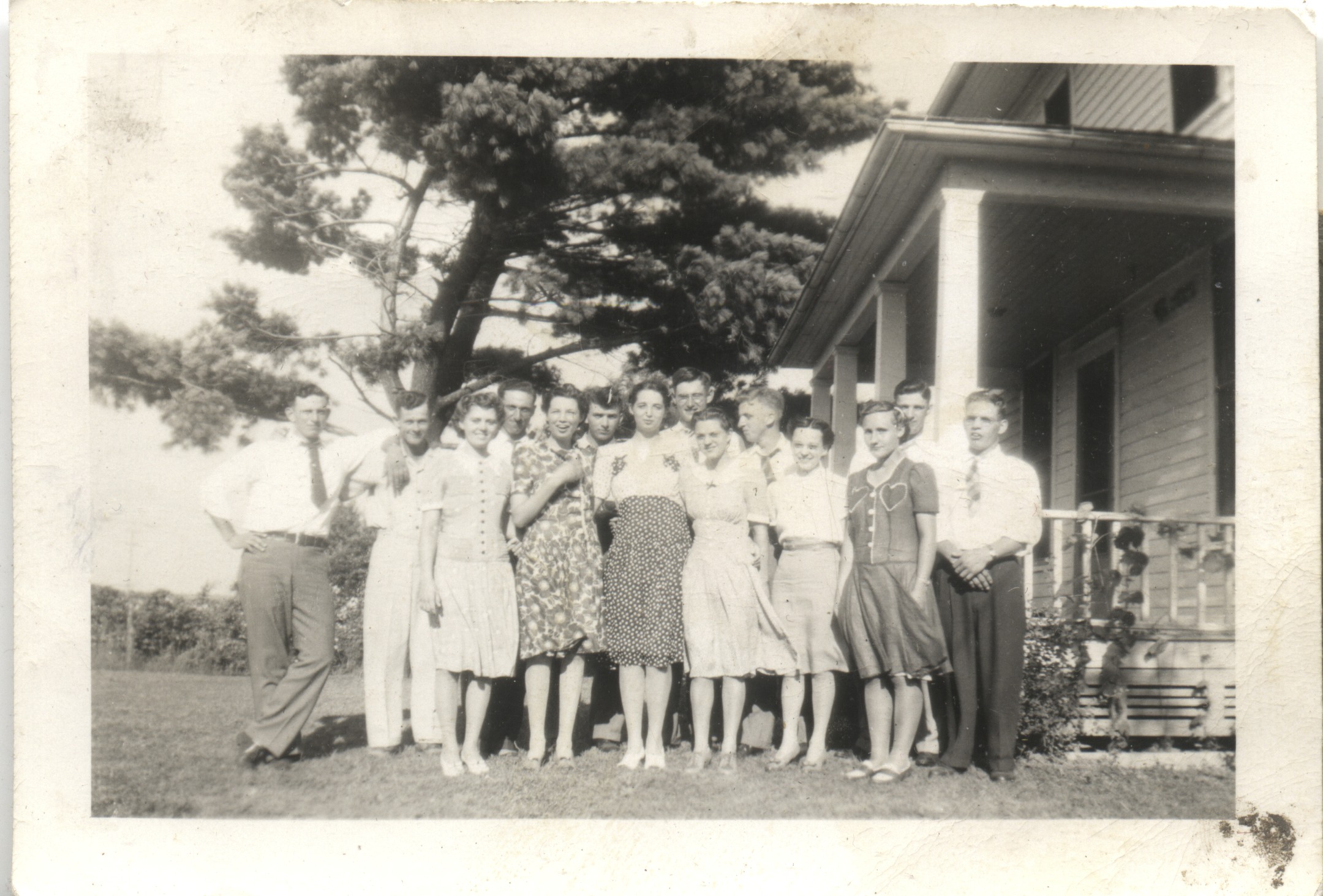 | Young Sugar Creek Adults: 1940c Front Left: Alberta Boese, Aldine & Alice Eichelberger, Irene & Edna Reschly, Dorothy Roth; back left: Bill Roth, Orval Miller, Henny Roth, Galen Widmer, Ray Roth, Marlin Wyse, Laverne Blosser, ? Kraybill. Taken at the Roth place on Hwy 78 unknown | 0096.jpg | Order | |