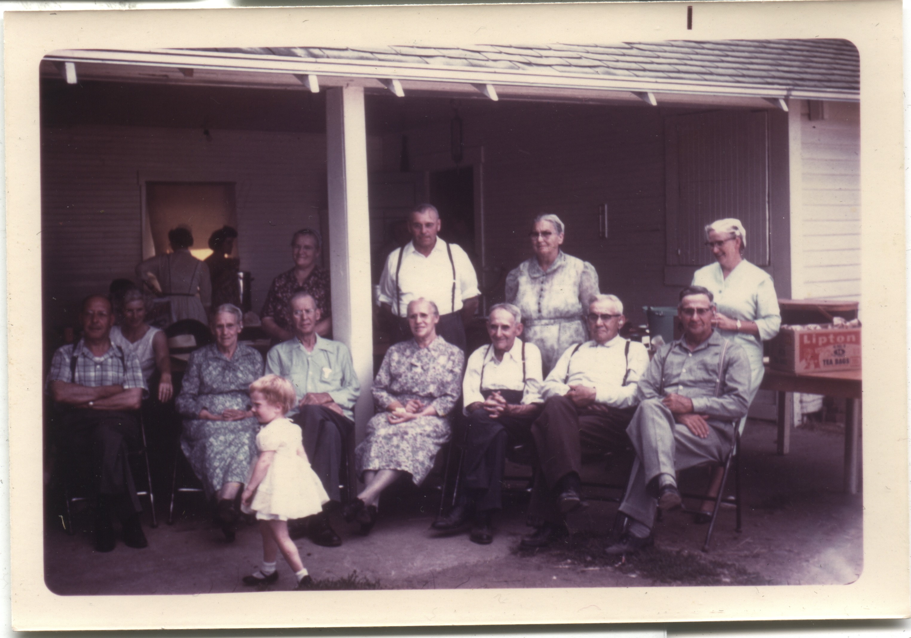 | Christian Gerig Family 1965c left to right: Ben & Silvia Gerig, Fannie Roth, Christian & Mrs Gerig, Lizzie & Dan Roth, Martin & Emma Gerig, Amos Gerig, and Henry & Bertha Gerig. Unknown girl in front and people in doorway. Place known, but probably in Oregon somewhere. | 0673.jpg | Order | |