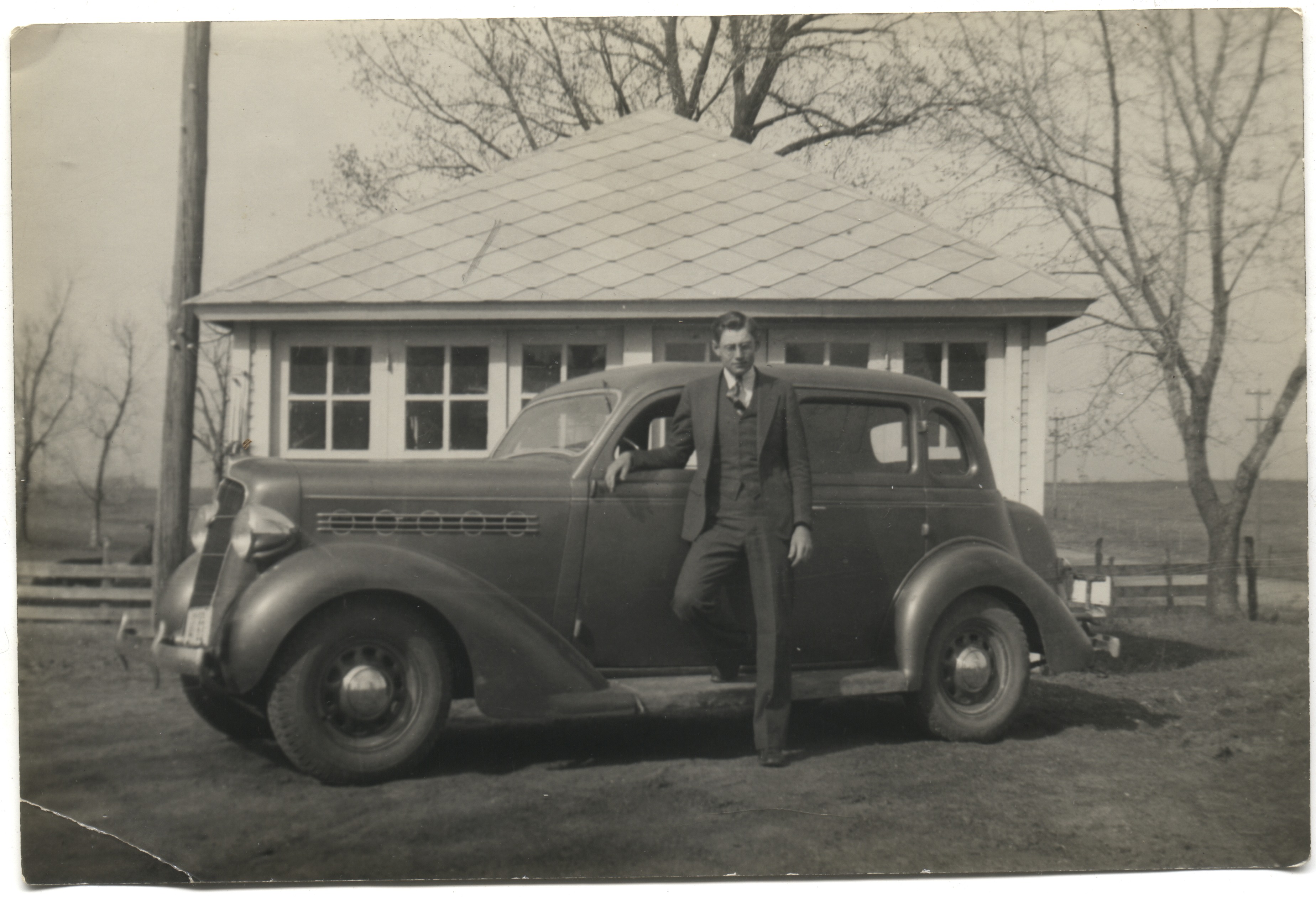 Ray J Roth with his car in front of the garage at the house on Hwy 78