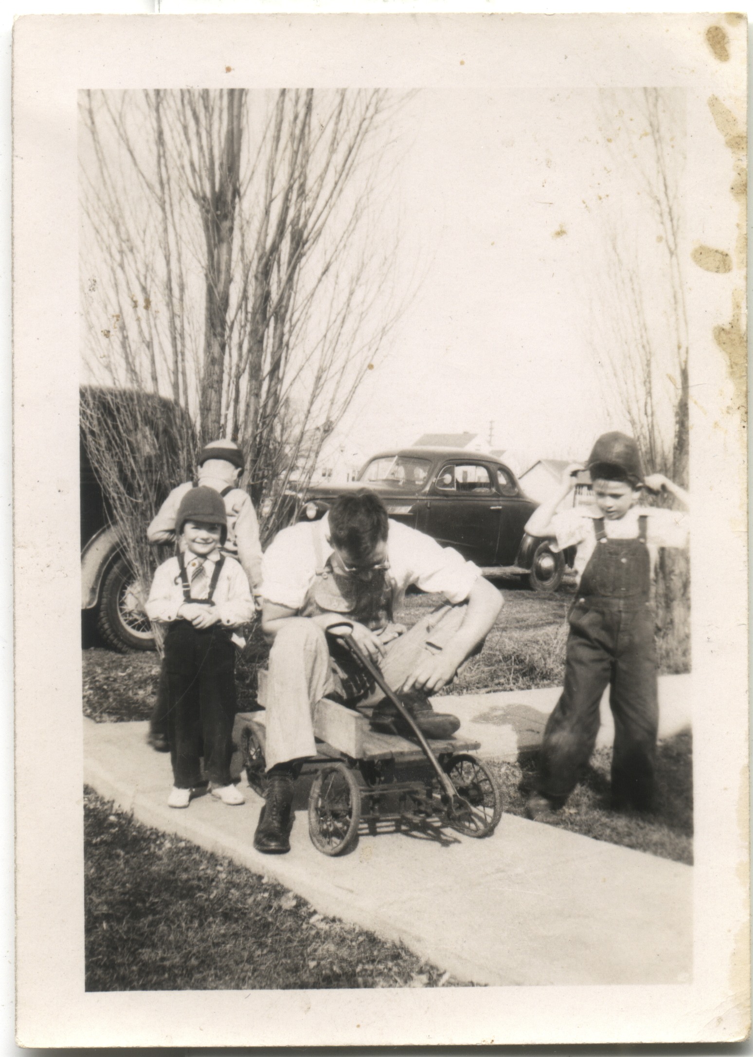 Ray on old wagon with kids.