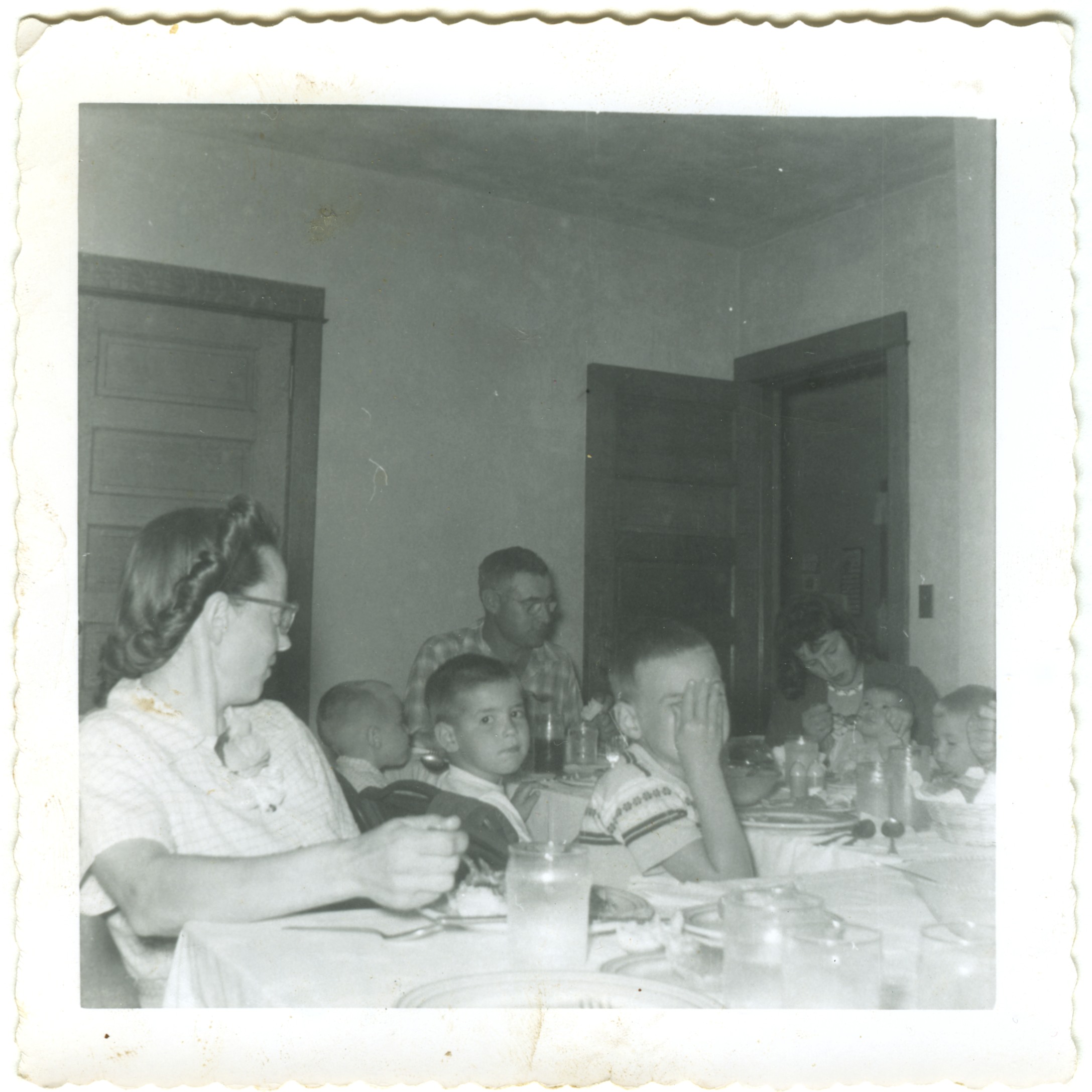 Edna, Lynn Roth, Steven Rebling, Lamar, Ray Roth, Donna Rebling, Rusty & Jim Rebling. At the Paul Reblings' house1958c