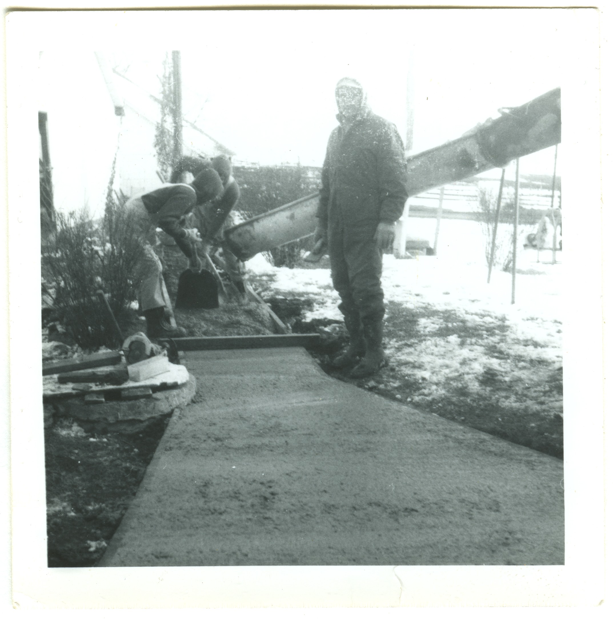 Ray, Fred, Larry Roth pouring cement sidwalk. 1961c