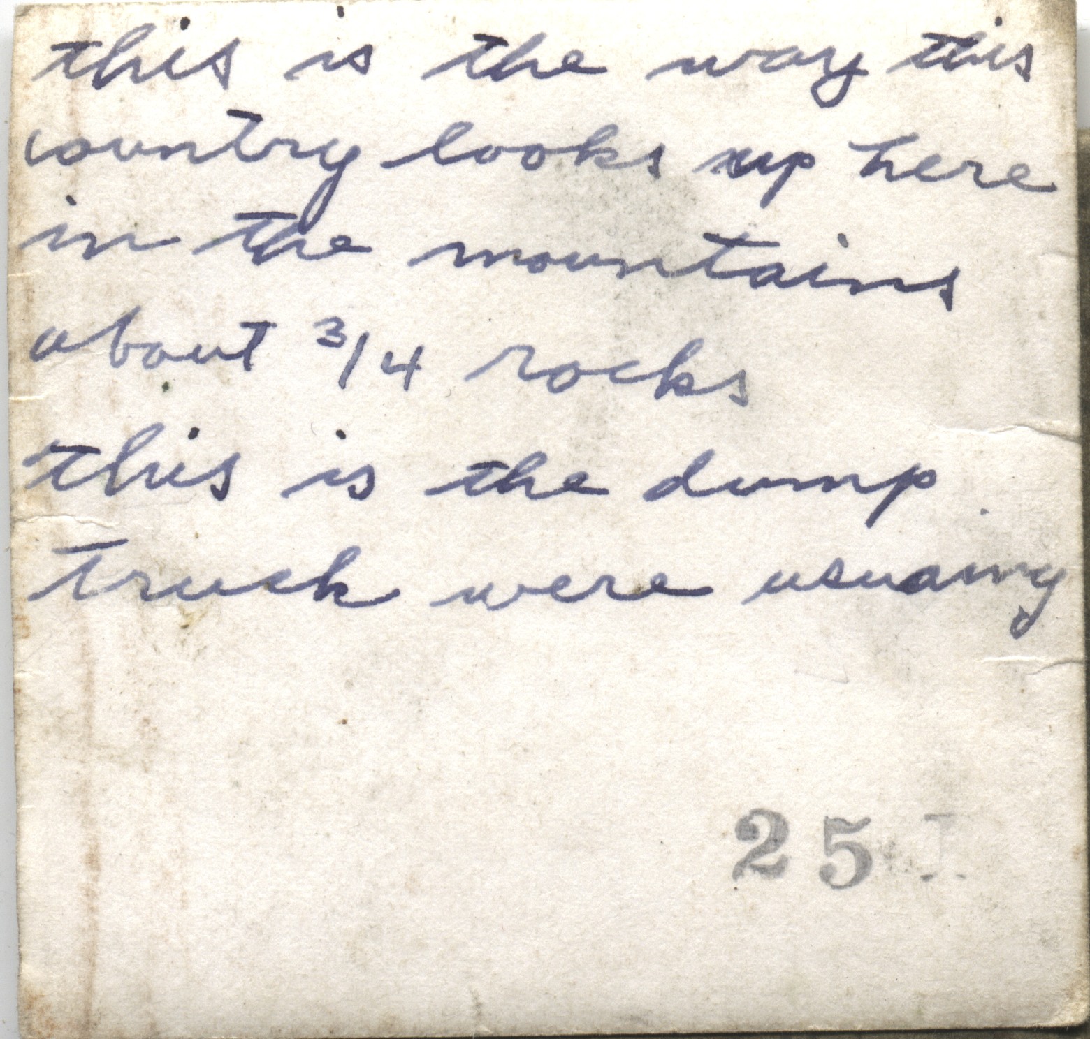 | 'this is the way this country looks up here in the mointains about 3/4 rocks. This is the dump truck we're using.' Harold Reschly, CPS 1945c | 0120B.jpg | Order | |