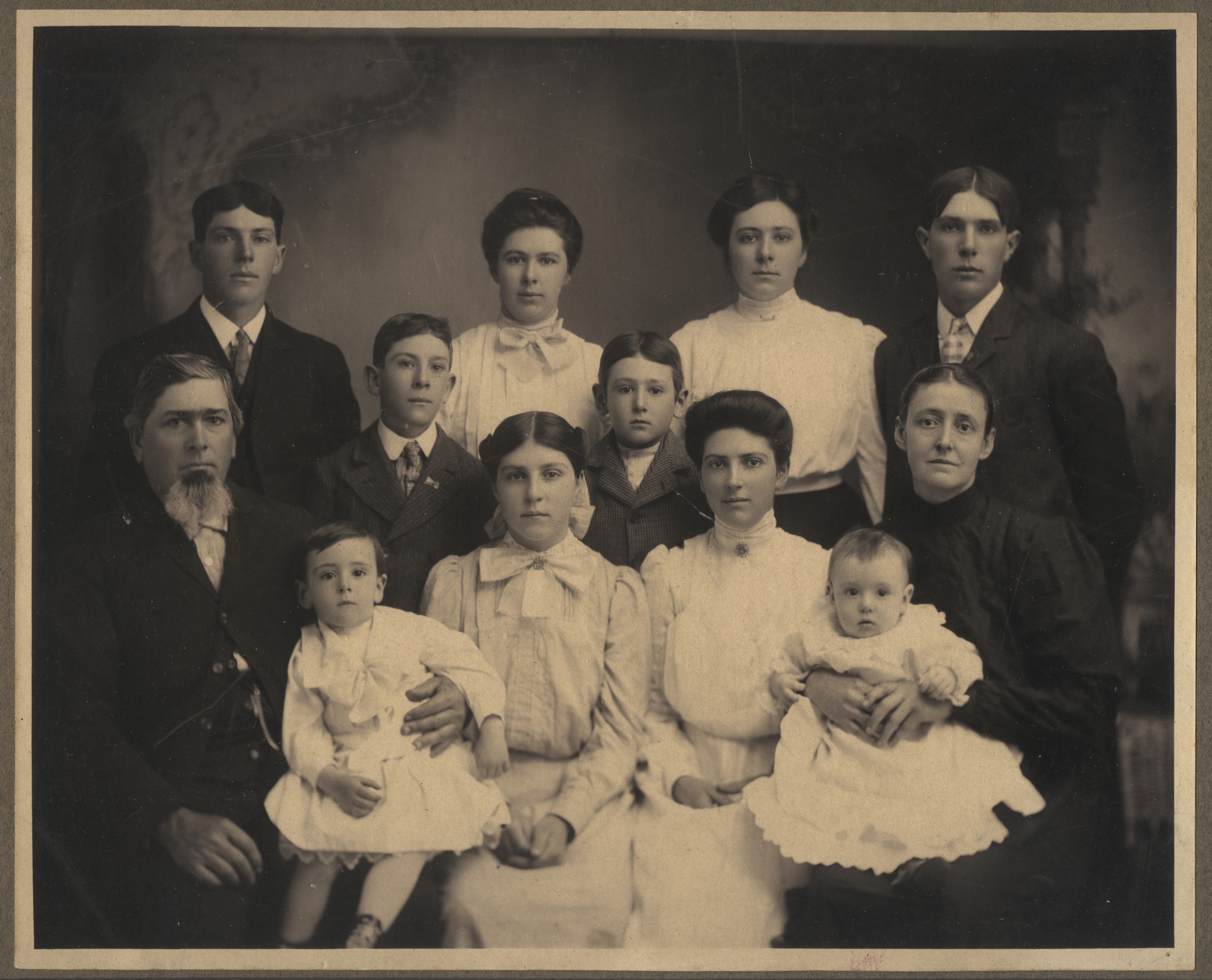| Joseph & Barbara Nebel Reschly 1907c. Ft: Joseph, Henry, Eva, Emma, Barbara, Ervin; Md: Harry & Joseph; Bk: William, Esta, Katie, Elmer | 0169.jpg | Order | |