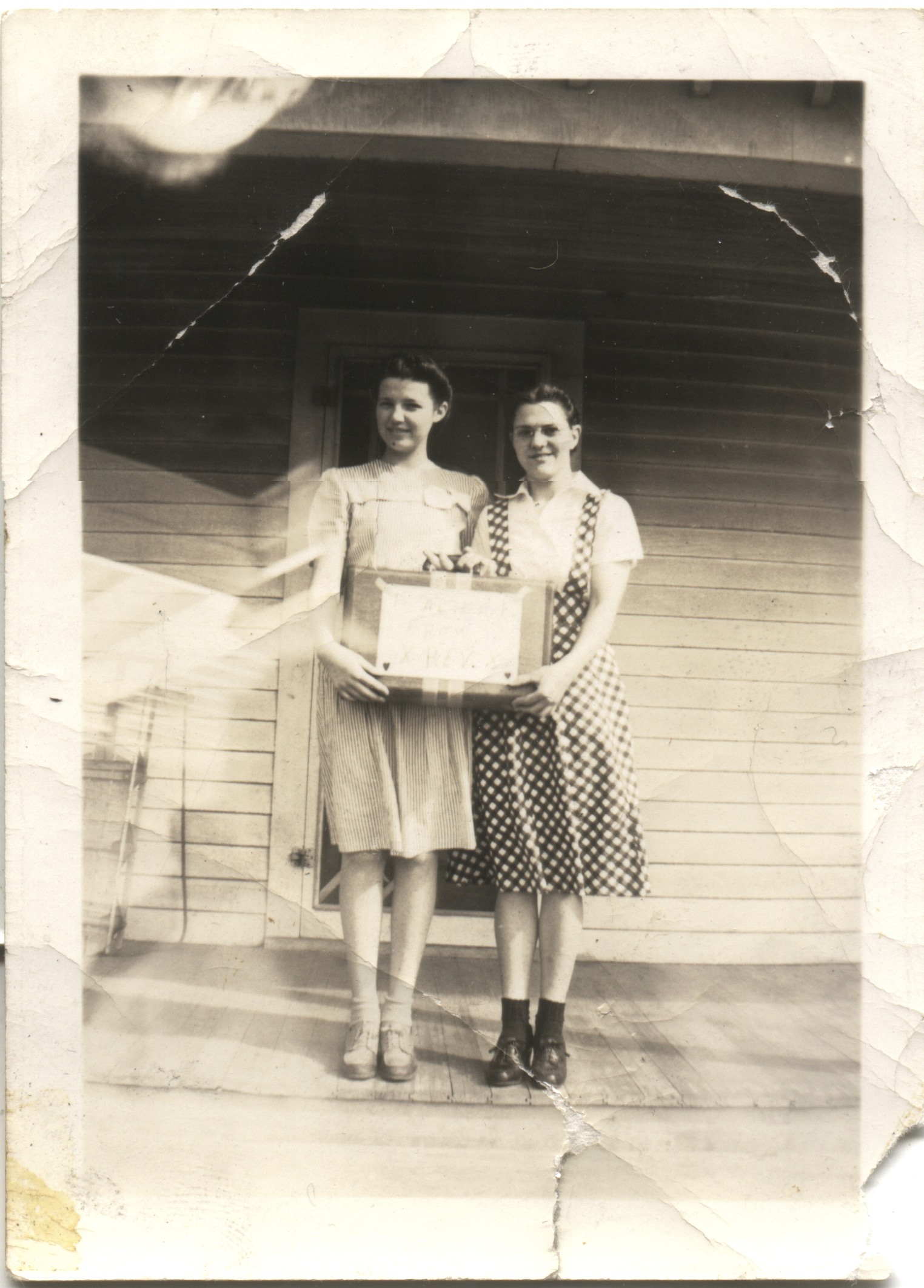 Irene Reschly & Aldine Eichelberger 1928c Writing on sign says "To: Alice E FROM: REV
