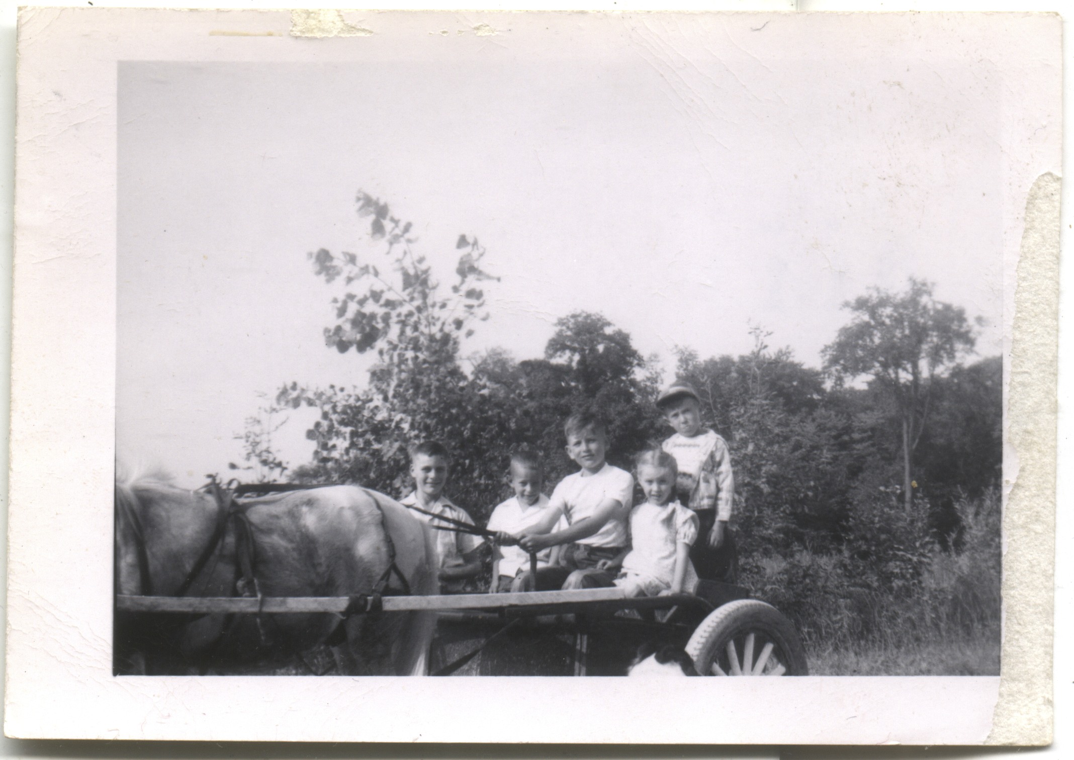 Gary, Ed, Rich Reschly, Alice Kauffman, Fred Roth mule/cart 1950c Ray & Fred Roth, Robert Kauffman