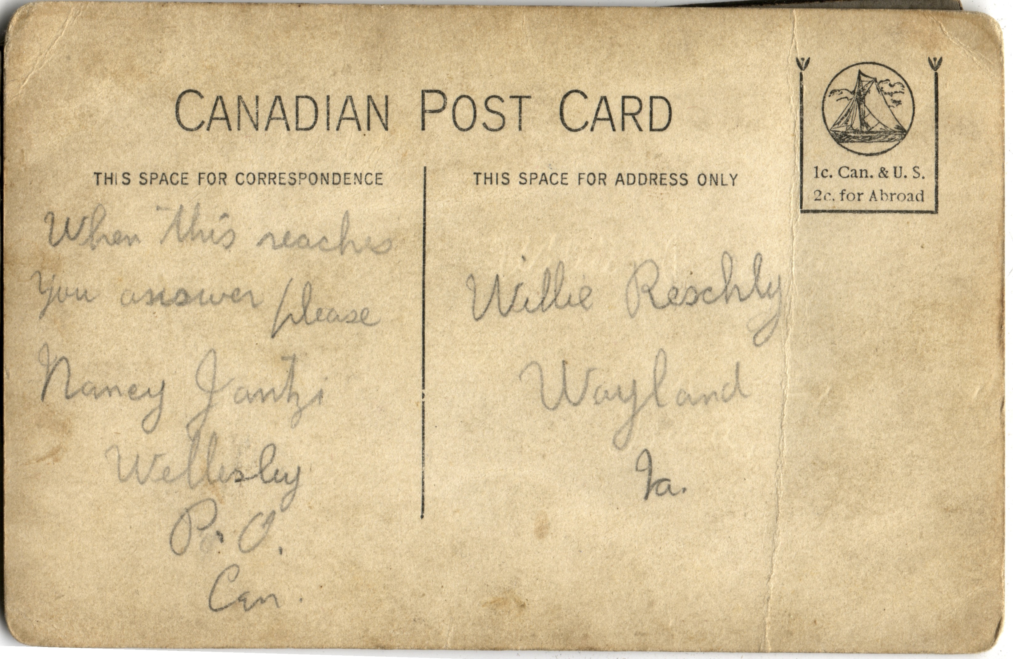 | To: Willie Reschly, Wayland, IA When this reaches you answer please. Nancy Jantzi, Wellesley, Ontario, Canada. 1928c | 0811C.jpg | Order | |