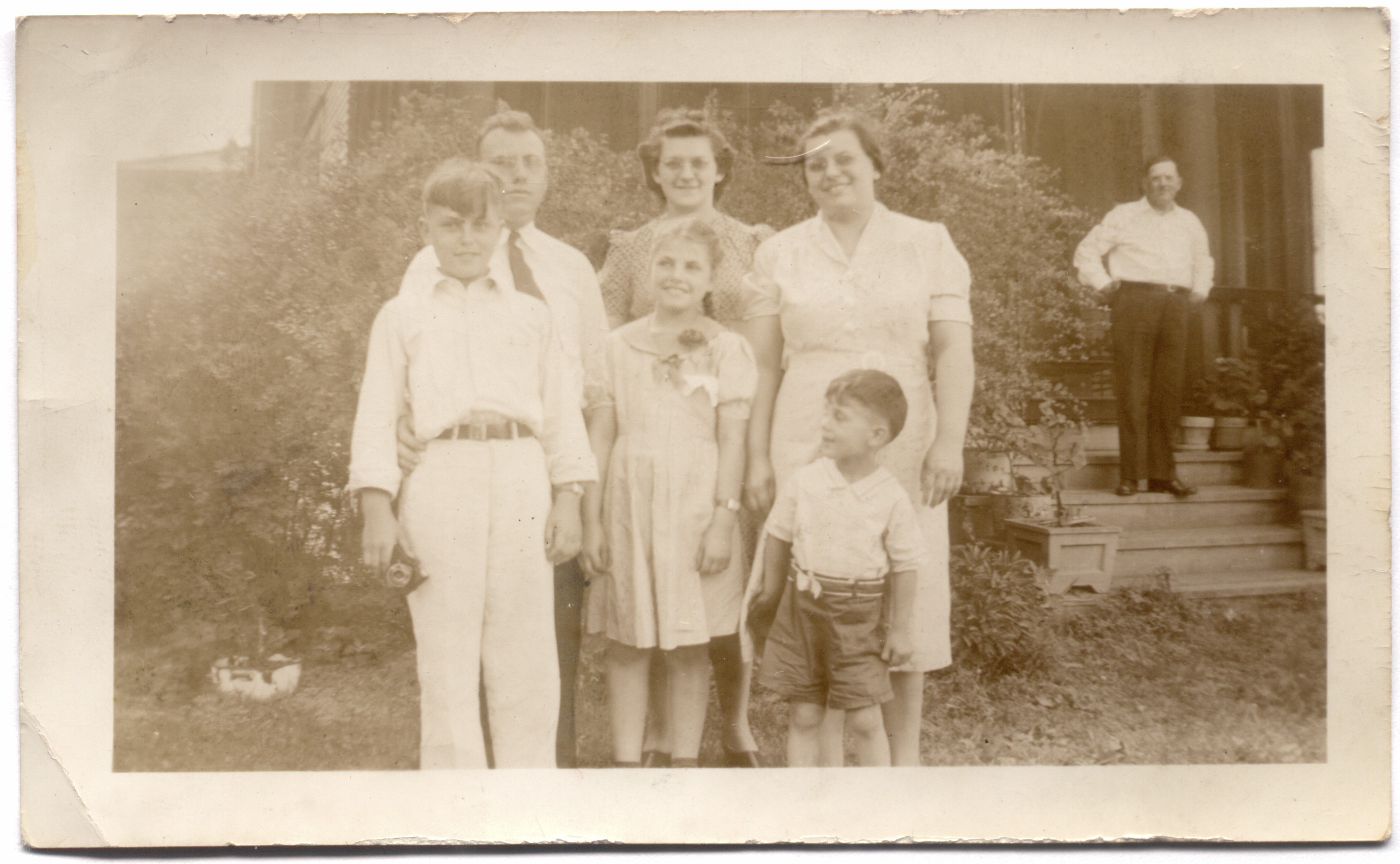 Ralph & Betty King & family, Millie O., and Willam Reschly on the steps. 1939c from Chicago, Ill.