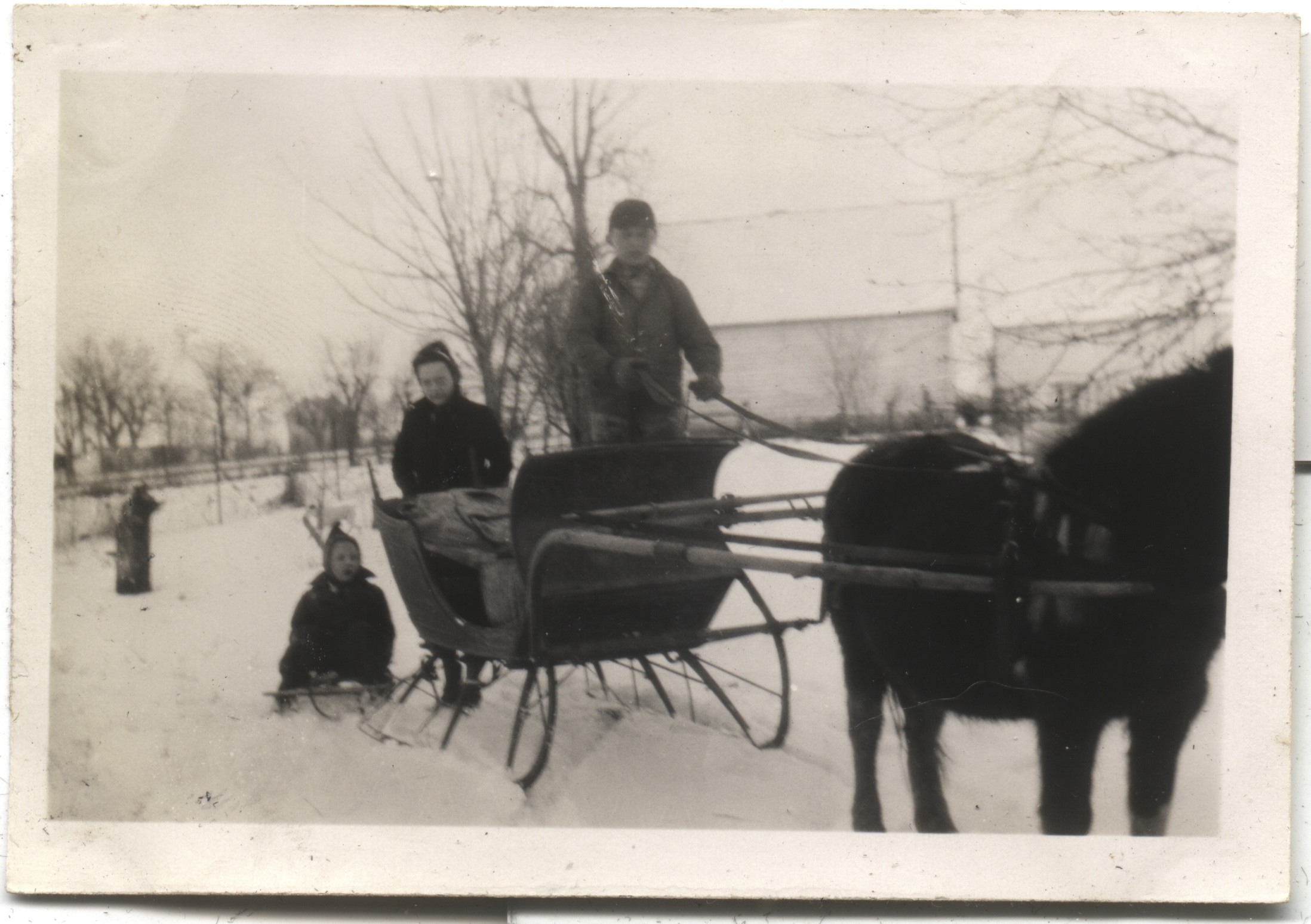 Sleigh ride. Edna Roth & unknown with a sleigh 1945c