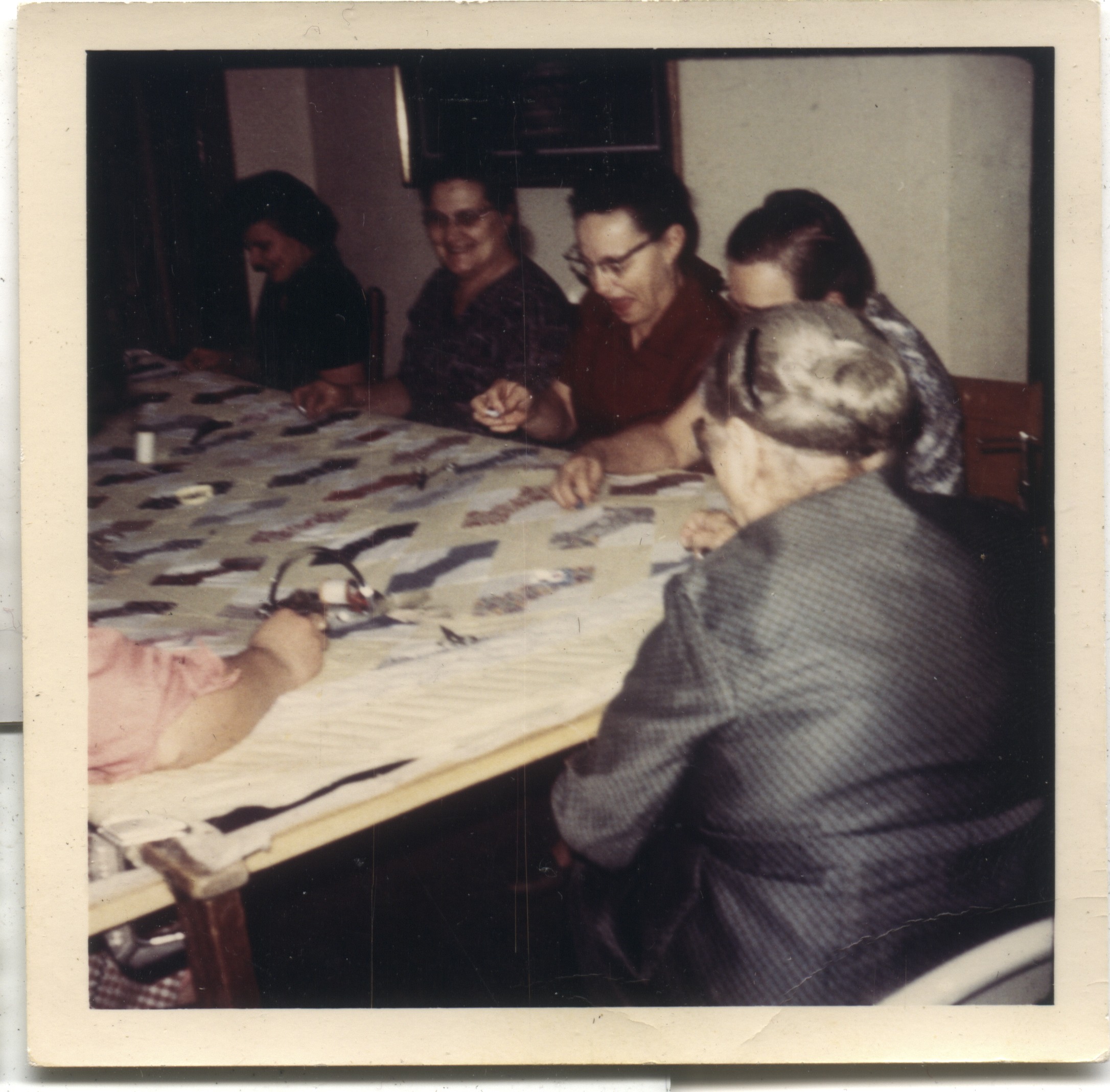 | Quilting Necktie Quilt for Lynn. Katie Reschly front with back towards camera, Esther Reschly, Wilma Roth, Mayme Roth, ??? 1968c unknown [set 0413] | 0675.jpg | Order |