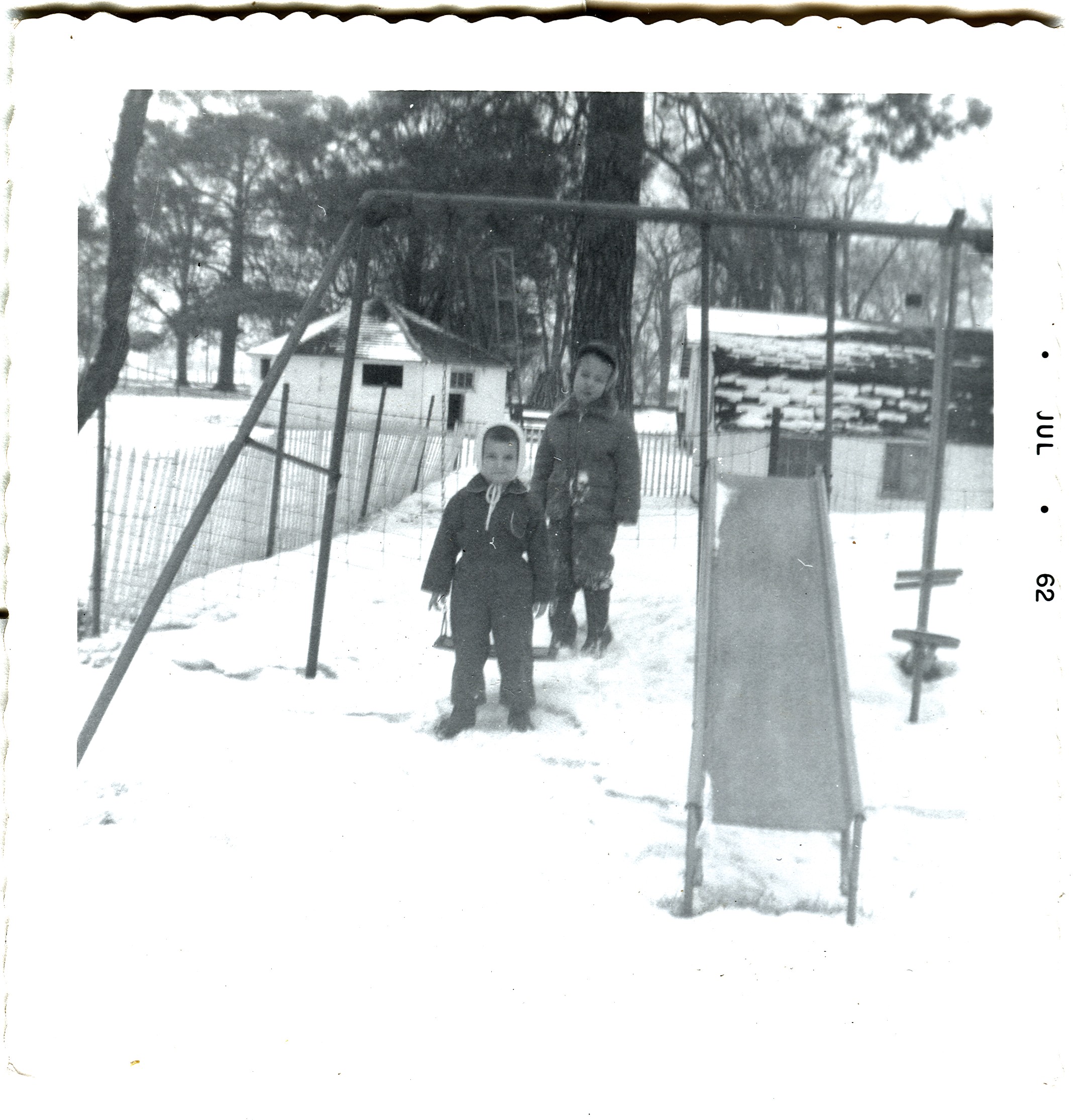 Lamar Roth & unknown. Swinging in the snow. 1962