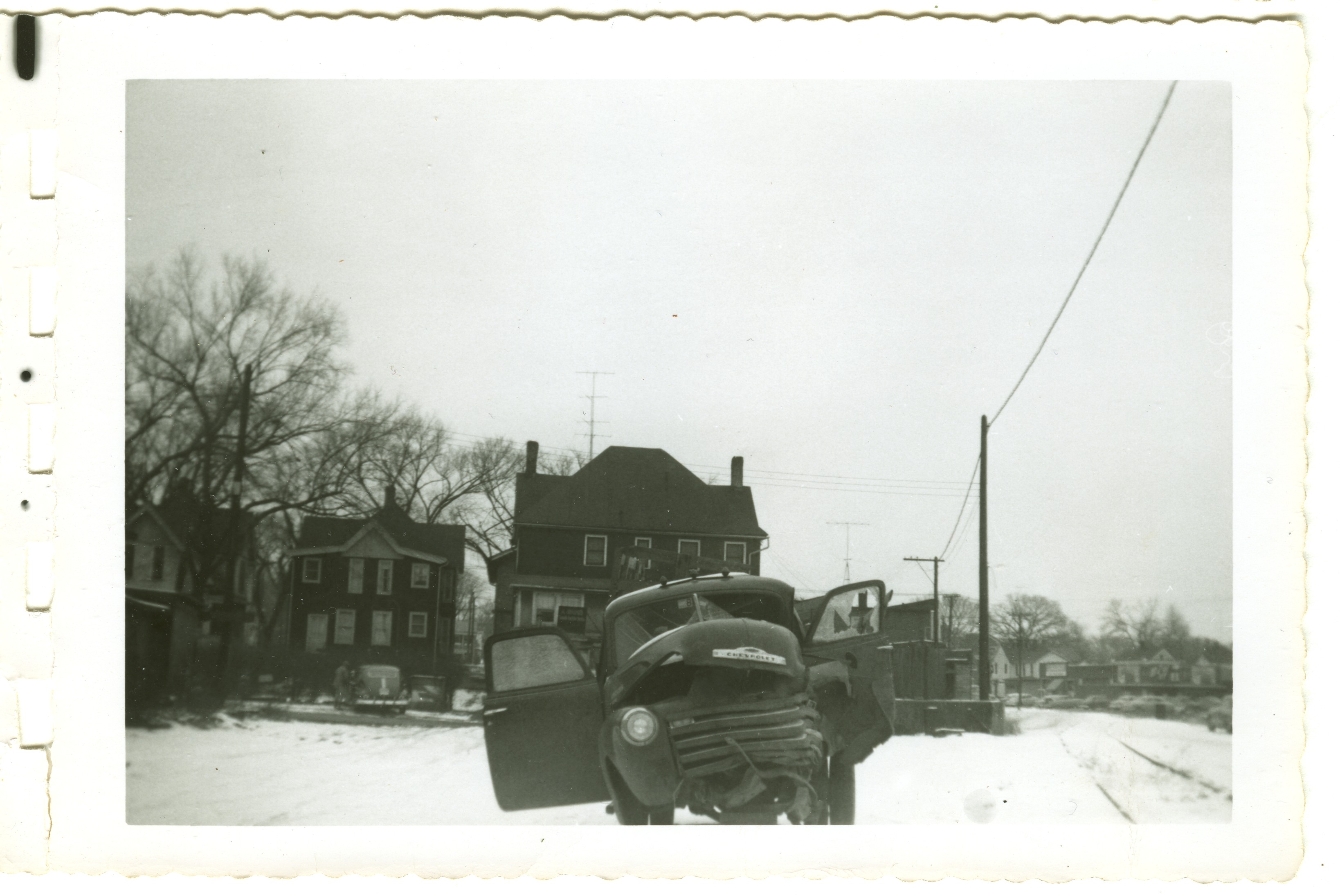 | Wrecked 54 Chevy 1 ton dualie truck driven by Levi Roth with Ray Roth as passenger. They were taking a load of Easter lambs to market in Waterloo, IA. A semi jack-knifed on ice, and the trailer slammed into them. Levi was pinned inside and Ray was thrown from the truck. Gas leaked from the tank and a fire started under the truck where Levi was. George Widmer came by in a semi and put out the fire with his fire extingisher. This occurred 1/2 mi north of Coralville Lake on old 218. The truck was in a wrecking yard in Iowa City, IA. 1956 | 1235.jpg | Order |