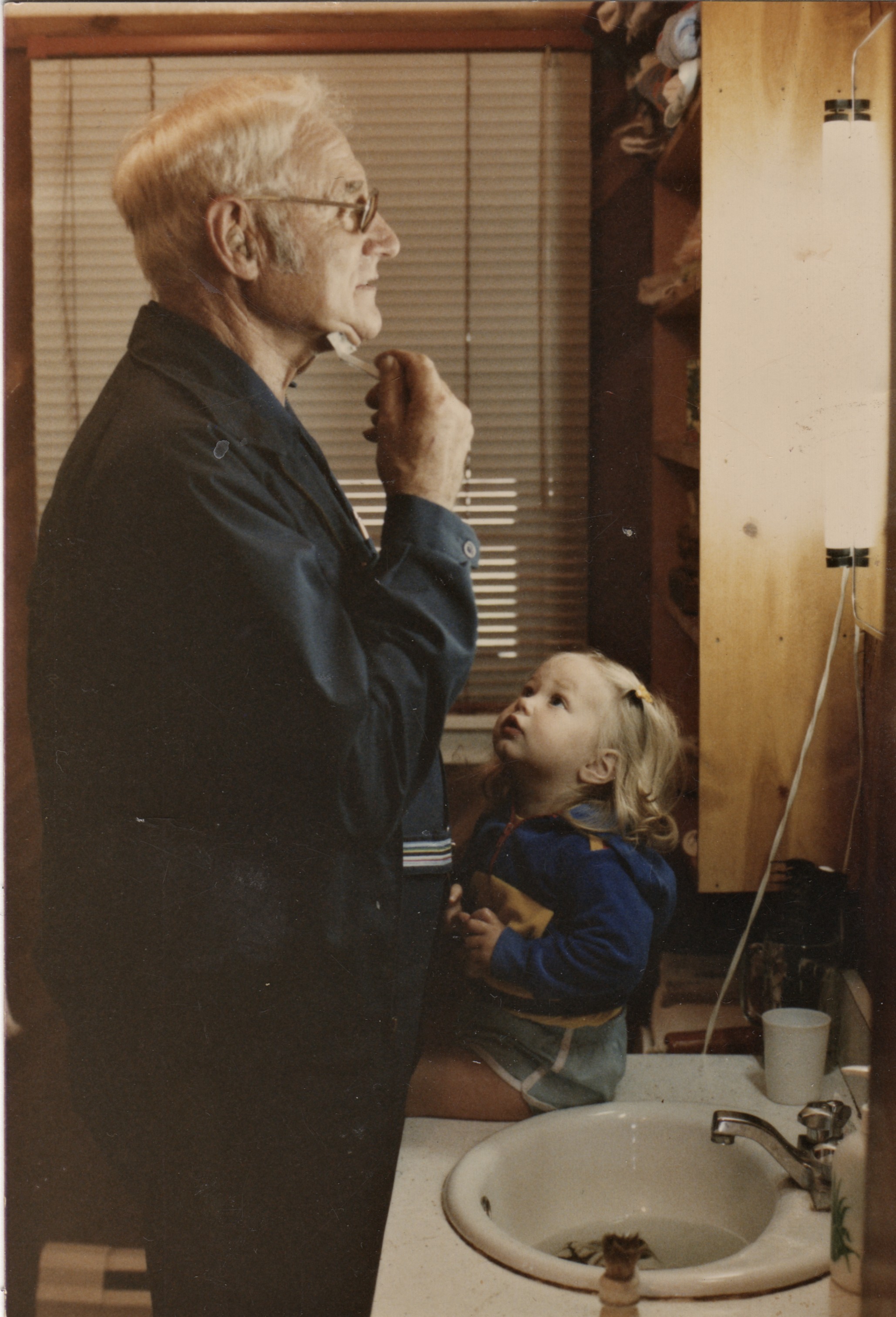 Meryl Roth watching Grampa [Ray] Roth shave. 1986