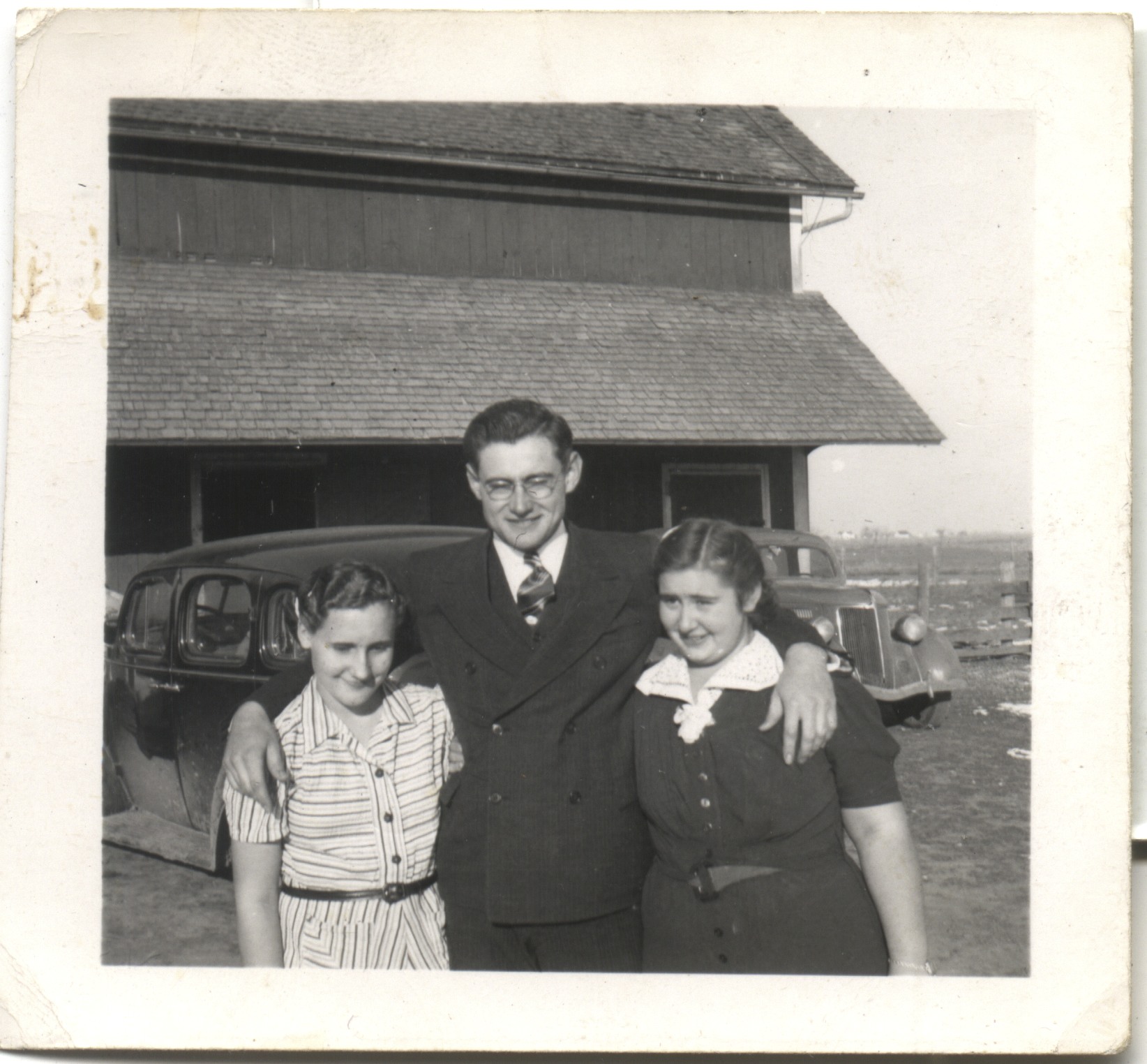 Dorothy Roth, Ray Roth, Marie Swartzendruber. Uncle & nieces. 1939c At the Roth homeplace on Hwy 78.