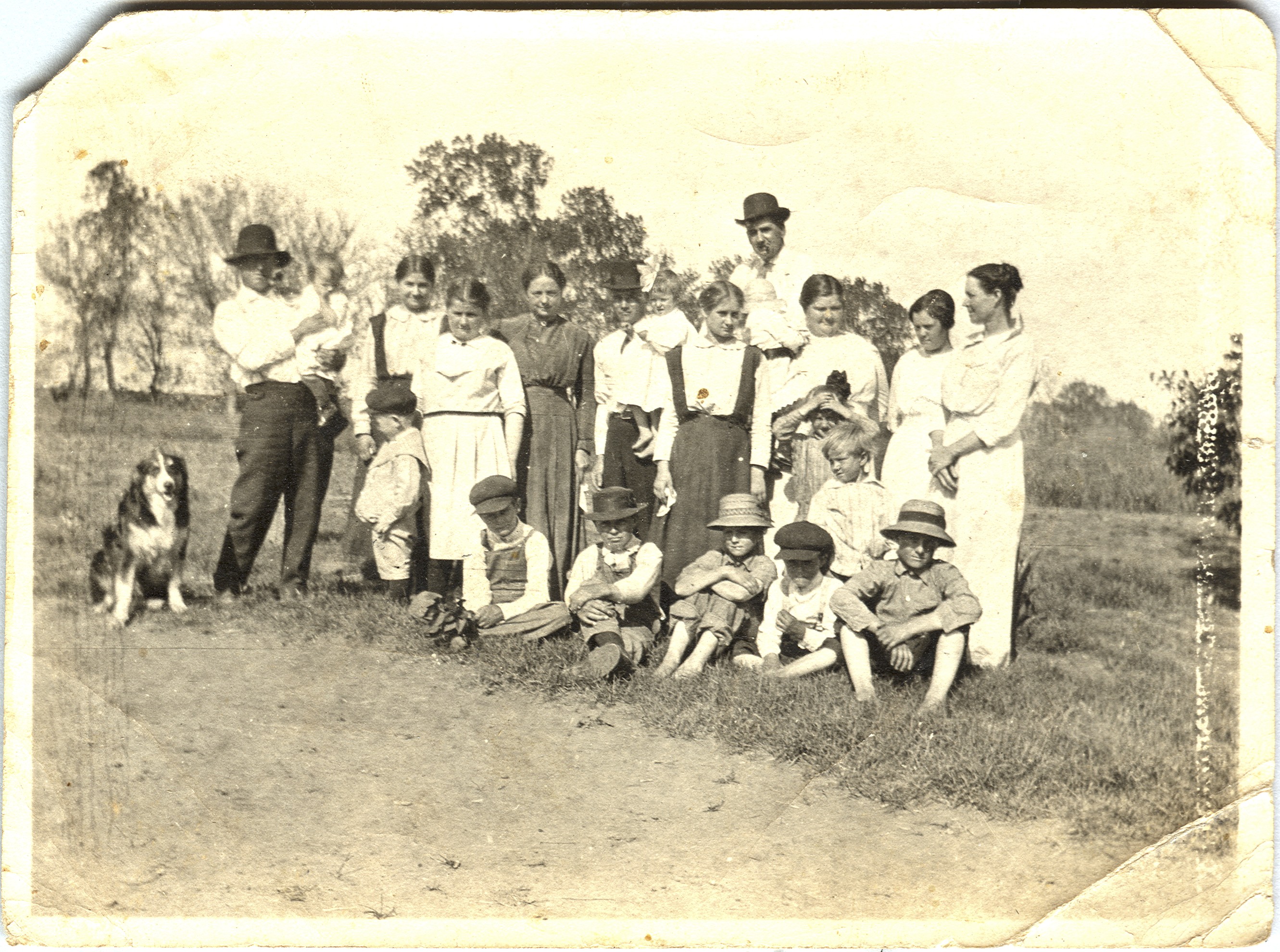 unknown group, Katie Swartzendruber, center; John Schrock, Alta Swartzendruber, 1903c