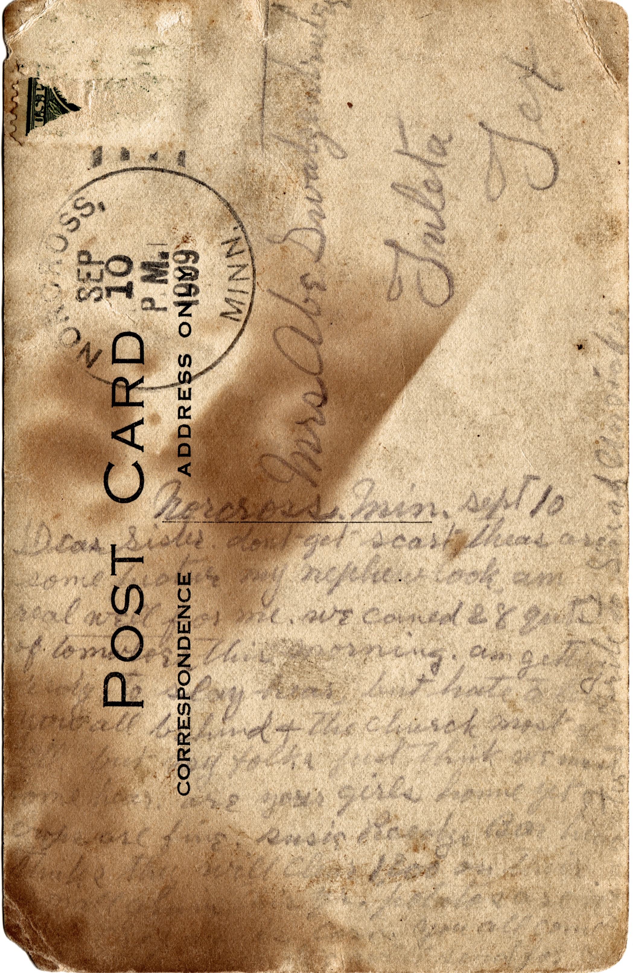 To Mrs Abe Swartzendruber, Dear Sister, Sept 10, 1909 Don't get scart. The