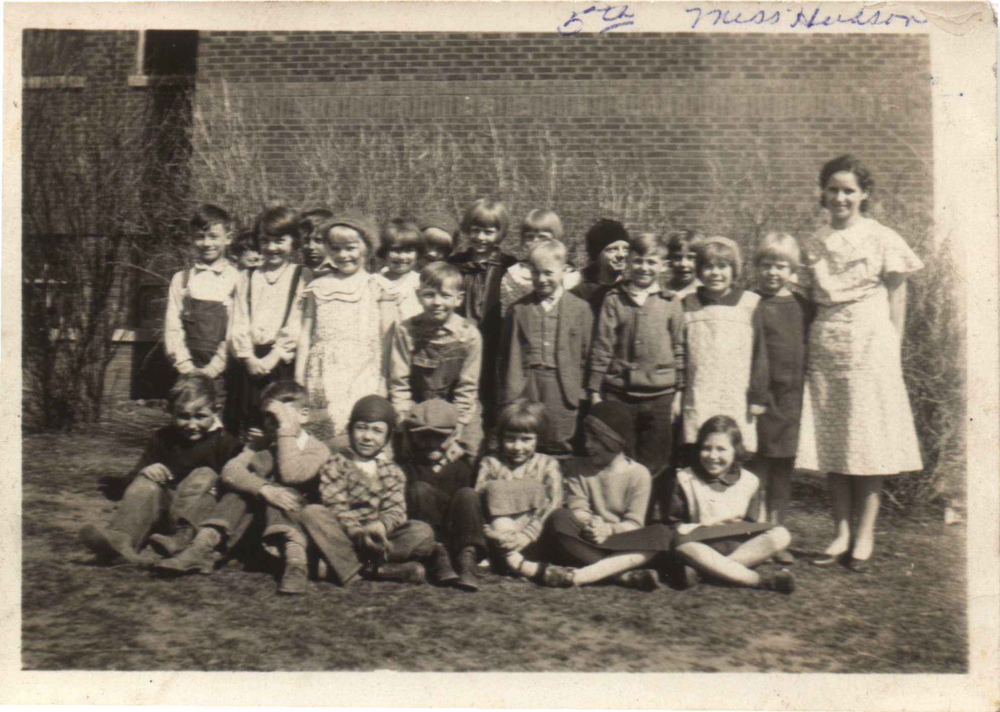 | Olds School 3rd, 4th, & 5th grade class with Edna Reschly Miss Hudson, teacher 1930c sitting l/r: Gerald Rogers, ???, George Miller, ???, Wanda Roth Brown, ???, Winona Tolander. standing front: Clarence Unkrich, Mary Lillian Unkrich, Maysil [?] Dewitt, stooped down, Roger Canel[?], standing back, Vicky Bergstrom, Mary Evelyn, front standing w/suit ? Leese, behind standing black hat Edna Reschly, front standing boy ???, back standing Arlene Johnson, front standing light dress Marion Palm, end standing Josephine Hultquist. Miss Hudson | 0060.jpg | Order | |