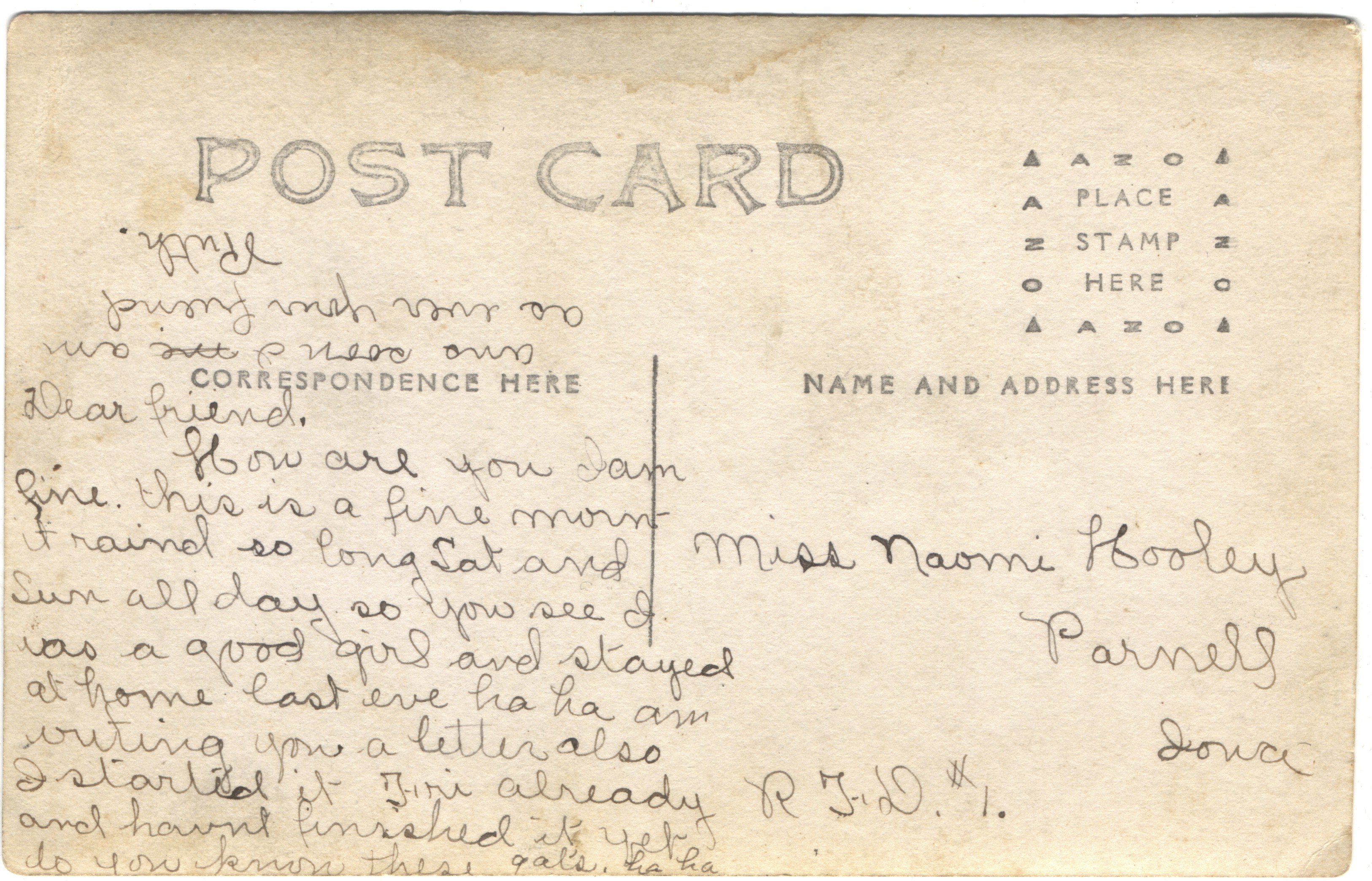 | Dear Friend. How are you. I am fine. This is a fine morn-it rained so long Sat and Sun all day so you see I was a good girl and stayed at home last eve ha ha am writing you a letter also. I started it. ??? already and haven't finished it yet. Do you know these gals. ha ha Answer me soon I am as ever your friend. Ruth. | 0186B.jpg | Order | |