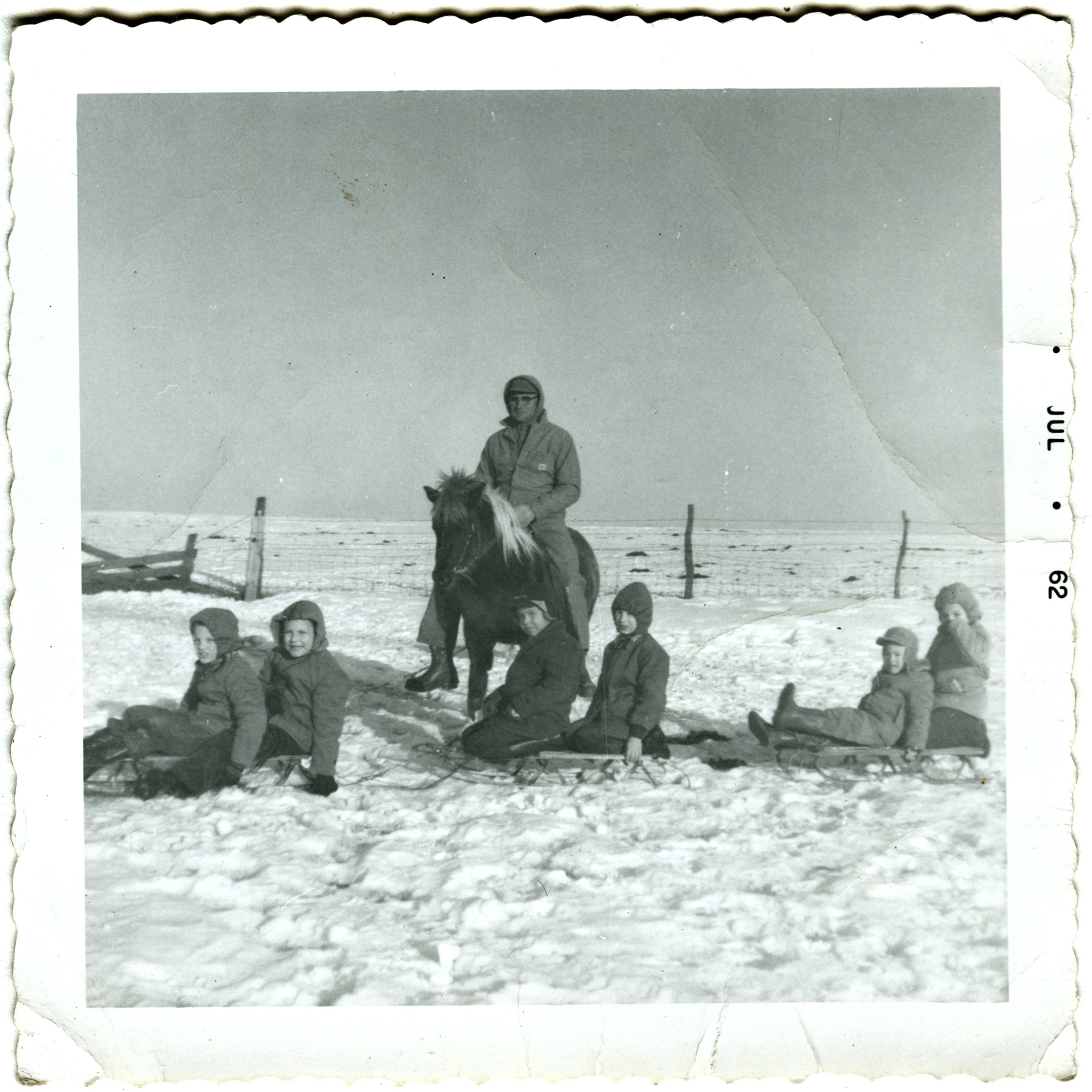 Sledding: Scott Wyse, ???, ???, ???, Lamar & Reynolds Roth, and Ray Roth on the pony. 1962